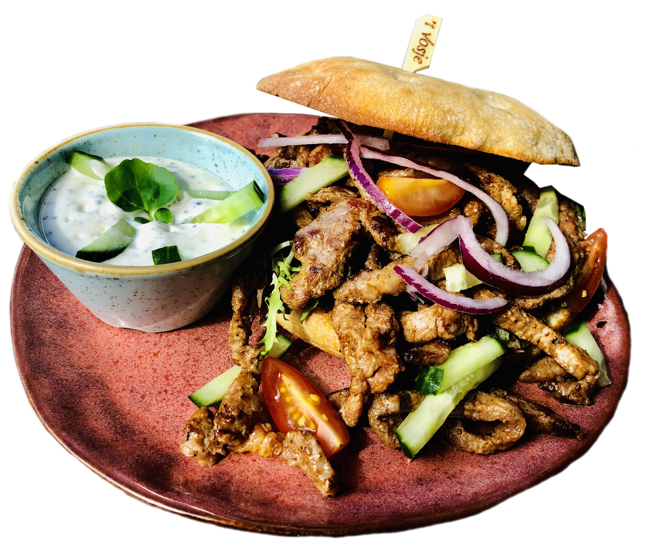 Rijkelijk gevuld broodje met vers gebakken gyros, tzatziki, rode ui, komkommer, tomaat en eventueel met sambalsaus?